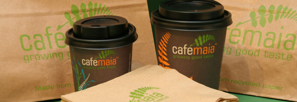 NapkinsGive away these napkins safe in the knowledge you’re not bashing the environment – they’re all made in the UK from unbleached, recycled materials. These two-ply napkins printed with Café Maia logo are made from unbleached, recycled UK fibre, near Leeds. 12.5 cm square, soft brown colour and supplied in cases of 4,000. |