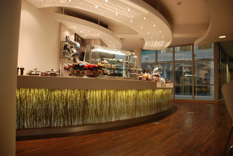 From the counter tops to the flooring and even the paint on the walls, everything in Café Maia has been made as eco-friendly as possible. Live plants were incorporated into the design for their reported health benefits, and the wall graphics and prints reinforce the Café’s commitment to using ethically sound products.